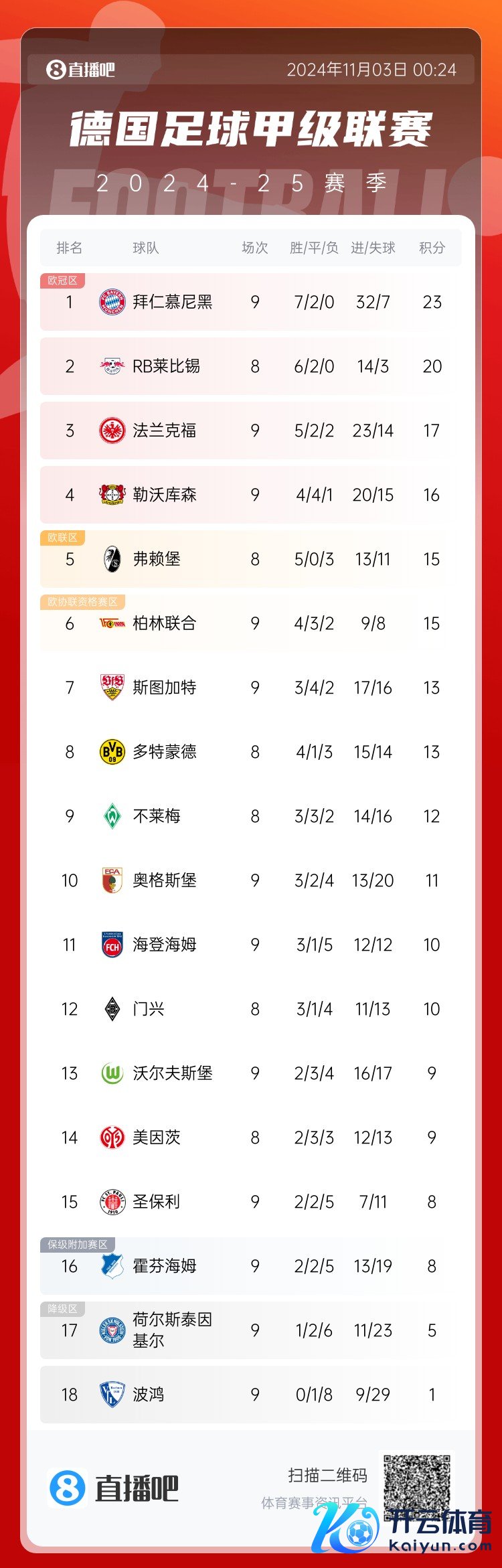 11月03日讯 德甲第9轮,拜仁3-0柏林聚拢,法兰克福7-2狂胜波鸿,霍芬海姆0-2圣保利,基尔1-0海登海姆,沃尔夫斯堡1-1奥格斯堡,当今拜仁7胜2平积23分,先赛3分领跑。