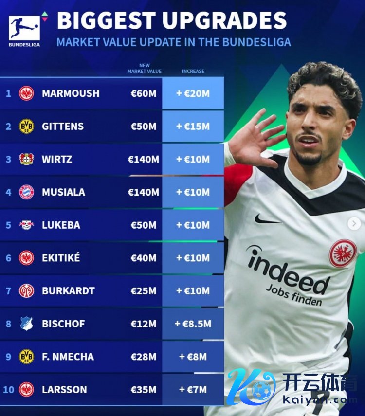 12月20日讯 《转会市集》更新了德甲球员最新身价,涨幅跨越500万欧元的球员情况如下,法兰克福4将在列。
