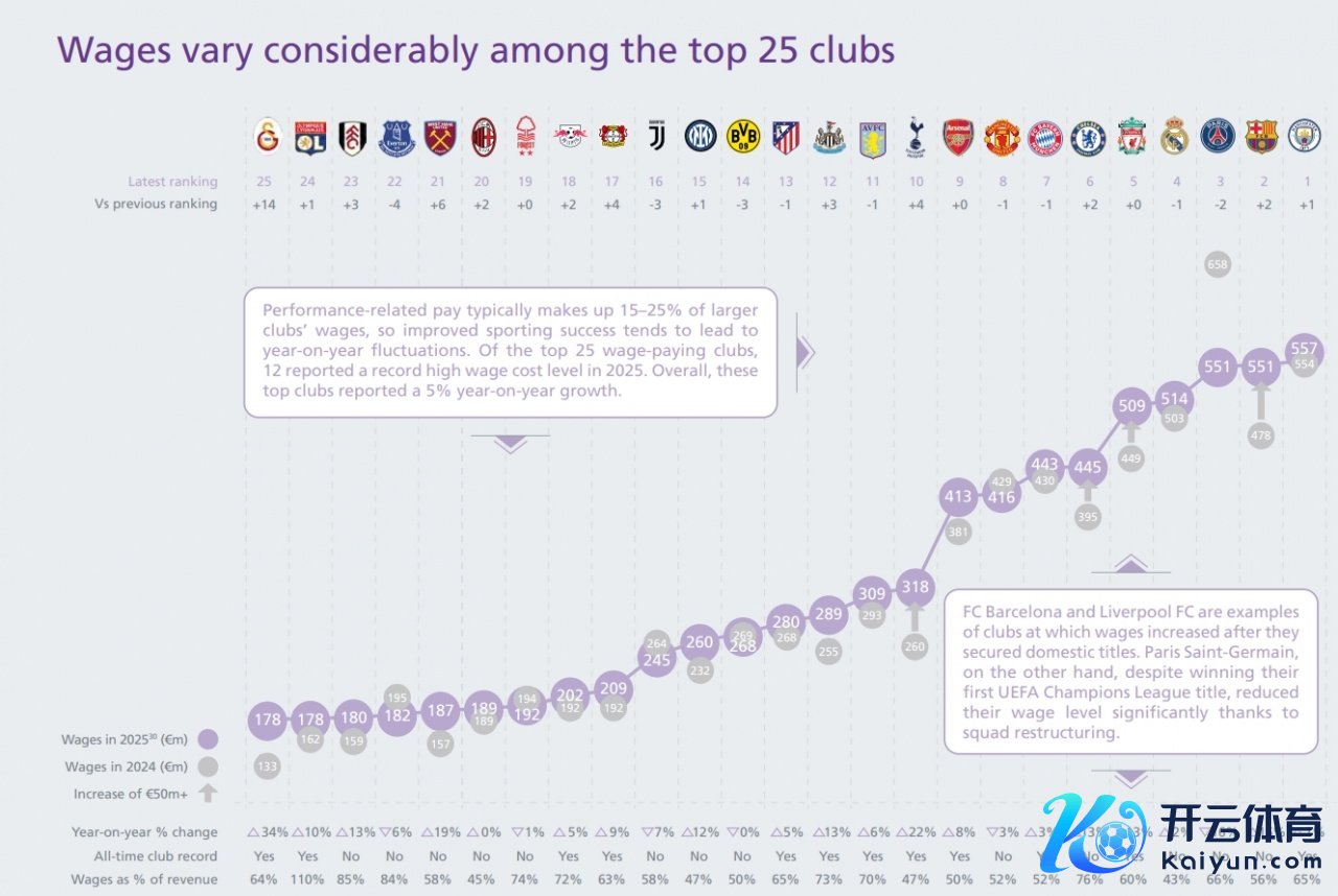 02月26日讯 欧足联公布新一期俱乐部财务气象论述,其中波及了欧洲俱乐部在2025年的薪资开销排行。