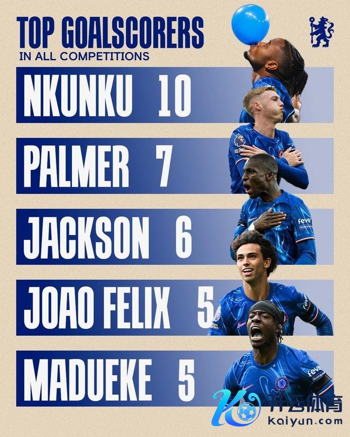 直播吧11月20日讯 据切尔西官方报说念体育集锦,恩昆库当今以10个进球排在队内弓手榜的首位。