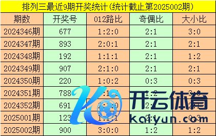 一、摆设三第2025002期开出号码900,其奇偶比为1:2,大小比为1:2体育集锦,号码012路比为3:0:0。该号码直选历史上出现了14次。