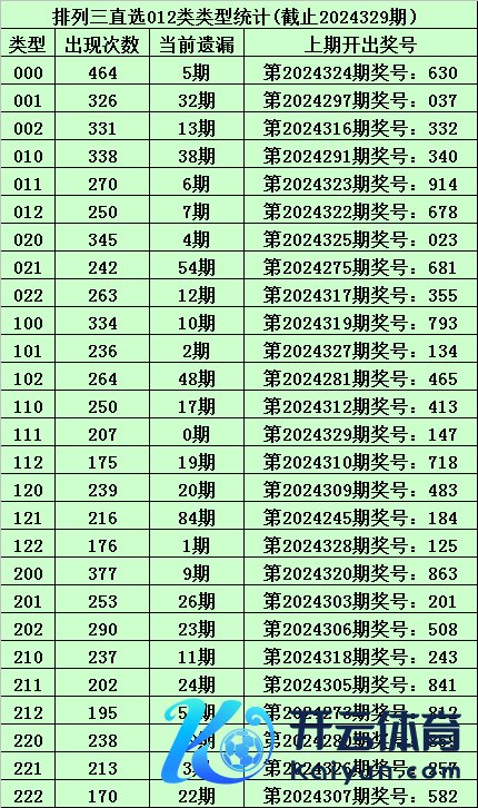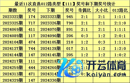 上期总结:体彩成列三第2024329期开出奖号:147,其012路比为0:3:0,奖号012路类型为:111。
